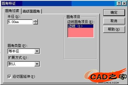 选择上图所示5mm的边,作为圆角的边,半径的值改成5mm,其他设置如图。
