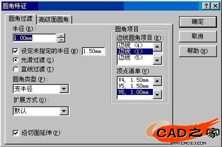 圆角的分类:混合面圆角,等半径圆角,变半径圆角