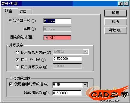 ●钣金 特征保存了整个零件的默认折弯参数信息(厚度、折弯半径、折弯系数、自动切释放槽比例和固定实体等)。