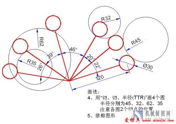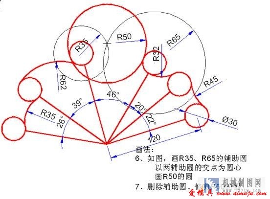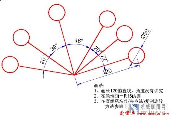 本题的相对比较简单:主要是训练复制旋转(夹点法)以及圆弧的画法。