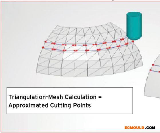 有两种类型的CAM计算:基于三角网格的CAM计算和基于表面的CAM计算。基于三角网格的CAM计算需要在几何图形上放置由三角形组成的网格,并使用交叉点创建NC代码。基于表面的CAM计算直接在零件的表面上投影点以创建NC代码(参见图1)。