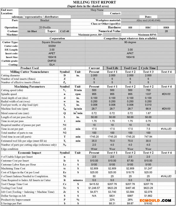 在这个典型的铣削试验报告中,试验1显示了刀具寿命翻倍的增益; 测试2使刀具寿命增加了一倍,刀片成本降低了25%; 和测试3从增加速度和进给,同时保持刀具成本。到目前为止,最大的经济收益表现为由于缩短的循环时间而提高的生产率。然而,每种情况都不同,通过使用更少的操作员来运行更多的机器,但是以更慢的速度/饲料获得的收益更难以量化。