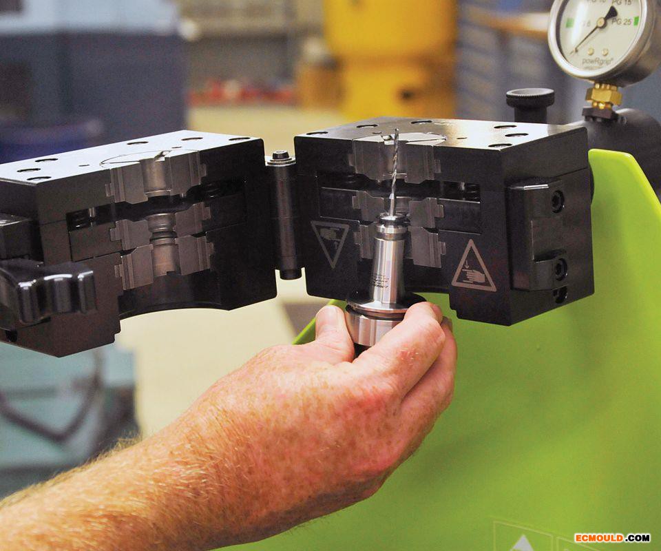 高精度刀夹系统提供精确(真正低TIR)和强大的夹紧力。图片由Rego-Fix和Evden Enterprises提供。