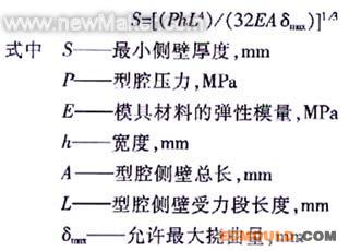 理论分析与实践证明,大型模具的刚度是中要问题,而强度足次要问题。故成型件尺寸应以满足刚度条件为前提,聚丙烯所允许挠曲量在0.03-0.04mm。将侧壁看作是受均布载荷的固定梁模型,由挠度公式可推出允许最小侧壁厚度: