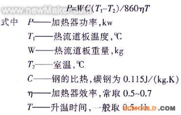 (1)加热流道板的热功率计算。热流道板相当于延伸了注塑机喷嘴,使得熔料流程大为缩短,有利于熔料的填充。但是采用热流道浇注系统需配备精碗的模具温度控制器,以防止熔料温度过高而烧焦。加热管功率一般凭经验按每kg热流道板需0.1-o.15kw估算,也叫按下式进行计算