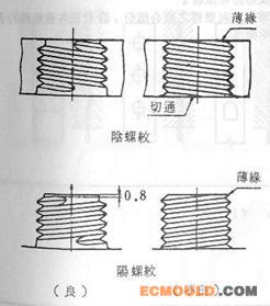 4. 螺紋不得延長至成品末端﹐因如此產生的尖銳部會使模具及螺紋的端面崩裂﹑壽命降低﹐所以至少要留0.8mm的平坦部分