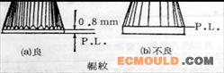 輥紋通常是平行于脫模方向的溝槽﹐輥紋間距通常為3.0mm,最小為1.5mm。為防模具崩裂及使后加工容易﹐輥紋與分模面間至少留0.8mm的平坦部分。