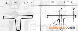 A. 原肋為表面形成收縮下陷之原因盡量減薄,肋原<=0.5-0.6T