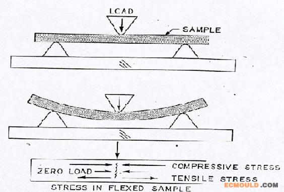 撓曲強度就是一個矩形試片兩端有支撐,而在中央施加撓曲應力時,該材料對撓曲的阻抗能力.撓曲強度是由測試棒破斷點負荷,試棒截面積,以及兩支撐點間距離計算而得,其單位為磅力/每平方吋.在這測試中,試棒的上半部承受壓縮力,而同時,下半部承受拉張力(如圖三所示).