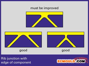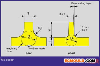 对于表面要求非常高的组件,如汽车轮盖,的尺寸是非常重要的。正确的设计可以减少组件形成表面凹痕的可能,以提高组件的质量。的底部的材料积聚在图1所示的圆中。这个圆的大小与的尺寸相关,应该越小越好,这样才能减小或避免凹痕。如果圆太大,可能会形成内部空洞,制品的机械性能将会非常差。