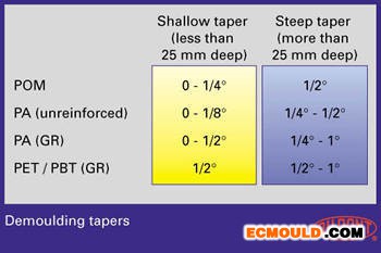 为确保带的制品容易顶出,必须设计一个适当的脱模锥度(见图2)。