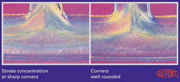 如果给一个有的组件以负载,则的底部可能会产生应力。在这一部位如果没有圆弧,可能会产生非常高的应力集中(见图3),通常会导致组件的断裂和报废。补救措施是建立一个半径足够大的圆弧(图1),使肋底部建立更好的应力分布。