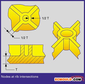 在塑料设计中,十字结构是最好的,因为它能应付许多不同的负荷排列变化(图4)。正确设计的可承受预期应力的十字结构,可以确保在整个制品上的应力均匀分布。在的十字交叉处形成的节点(图5)代表材料的积聚,但可以将节点中心挖空,以防止产生问题。还必须注意,不要在交叉处和组件的边相交的地方形成材料积聚(图6)。