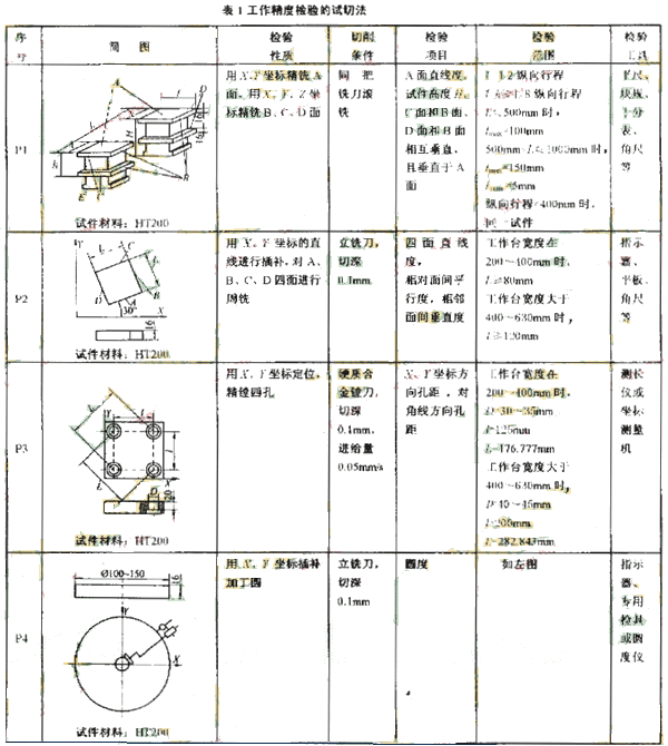 传统数控机床按照笛卡儿坐标体系设计,属串联相接、层叠嵌套的悬臂结构,各传动链之间误差作用是累积的。虚拟轴数控机床(又被称为并联机床,六条腿机床,虚拟轴机床或新型敏捷制造加工中心)是机床家族的新成员,它抛弃了传统的固定导轨刀具导向方式,采用了六自由度并联机构(Stewart 平台)为其结构主体,因而理论上可以加工任意复杂曲面零件(如叶轮、模具等)。另外,这种新型机床各伸缩杆的运动效果耦合,具有精度高的潜在优势。 机床精度检验通常包括几何精度、位置精度和工作精度检验。目前,尚未见到ISO组织或某国针对虚拟轴数控机床精度检验制订的标准。本文参照传统数控机床精度检验的内容,并结合虚拟轴数控机床的特点,拟订了其工作精度检验方案。 1 传统数控机床工作精度的检验围绕传统数控机床工作精度的检验,美国NAS979(国家航宇标准)制订了“圆形—菱形—方形”试件切削实验(简称试切法)标准,我国也有类似的标准。 表1 为用试切法对数控万能工具铣床进行精度检验的方法。