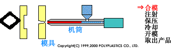 所谓模具(Mold)是指,为了将材料树脂做成某种形状,而用来承接射出注入树脂的金属制模型。虽然没有图示记载,但实际上有几个空孔,并用温水、油、加热器等进行温度管理。
