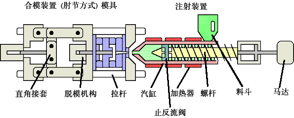合模装置是开闭模具以执行脱模(eject)作业,而且也有如图所示的肘杆方式,以及利用油压缸直接开闭模具的直压方式。