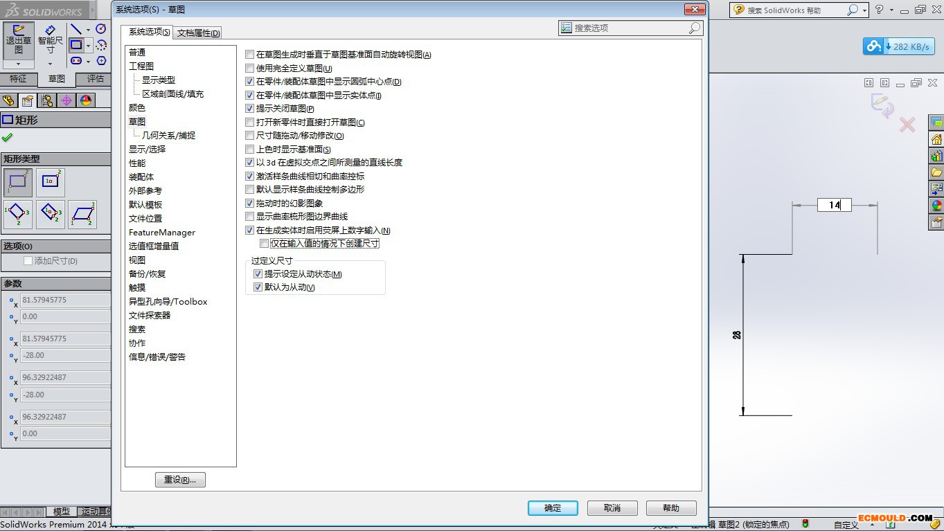 solidworks画草图直接动态输入数字改变图形大小,如图,选项-草图-在生成实体时启用荧屏上的数字输入 勾选即可