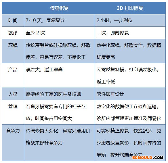 与传统医疗技术相比,3D打印这项创新技术能做到个体化、个性化定制,在尊重和掌握个体差异的基础上,使齿科诊疗更加地精细化和精准化,具有传统义齿加工方式无可比拟的优势,整体提升齿科诊疗技术水平。以口腔修复为例,传统修复和3D打印修复在就诊时间、牙科产品差异、牙科产品竞争力上都有很大的区别,详细对比请见下图。